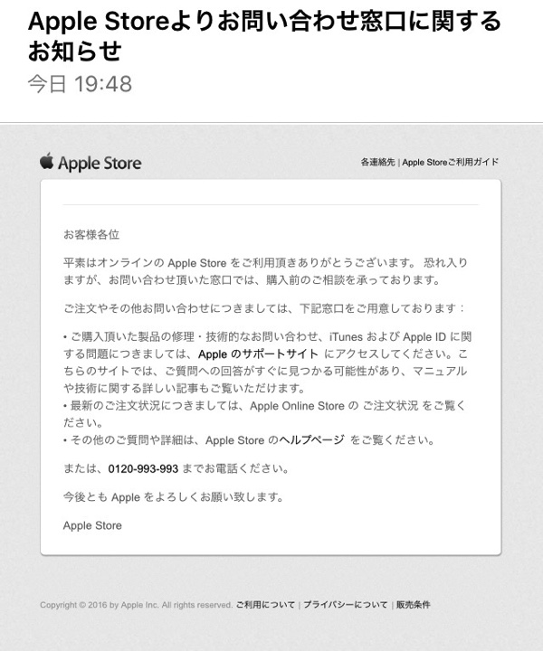 Apple Storeへは行けない距離ではないのですが、まずは電話をと思いフリーダイヤルに電話しました。