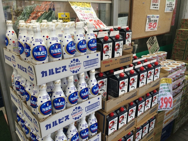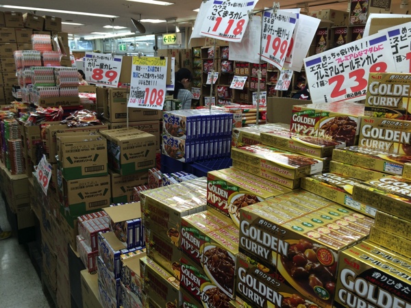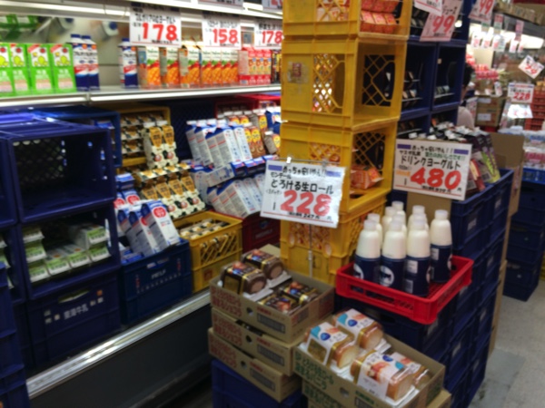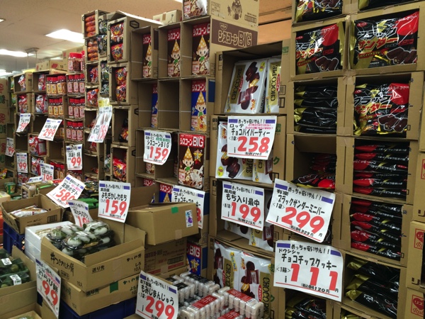 2つ目は陳列方法。「ここは倉庫か?」と思うような陳列方法。ダンボールのまま積んであります。たしかにこれなら什器もいらないし手間もかかりません。ただPOPを付けるだけ。商品が売れたら空になったパッキンを捨てるだけ。効率良く販売できますし面積も取らないのでたくさん置くことができます。これは賢い。ドン・キホーテの圧縮陳列も有名ですがここはそれを凌駕しています。
