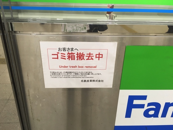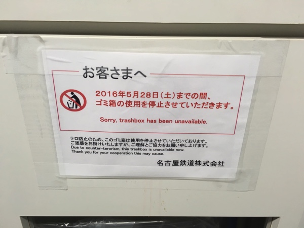 もし、ここ一週間以内に伊勢志摩や名古屋を訪れる際はご注意ください。出張などで名古屋へ来る際にお弁当を買って車内で食べたとしても捨てる場所がありませんので降りてからしばらく持ち歩くことになります。今週だけは乗る前に食事を済ませておくか、降りてから食事をしましょう。ペットボトルを捨てる場所もないのでカバン内には1本分スペースを空けておきましょう。