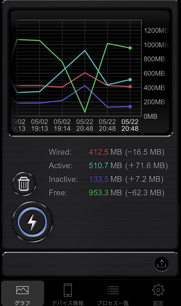 稲妻マークをタップするとメモリを開放してくれます。どうも動作が重たいと感じた時はこのアプリを起動せさてメモリクリーンしてみてください。5Sの時は頻繁に利用していましたがiPhoneSEになってからは使う回数が激減しました。もし、メモリクリーナーを探しておられるならこの“iMemoryGraph”をおすすめします。