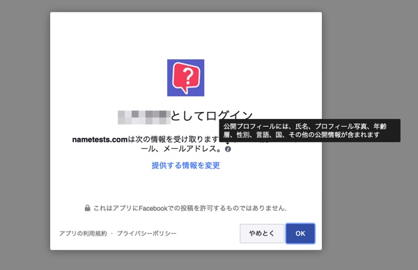 これらのサービスを利用するにはFacebookアプリをインストールする必要があります。その際にさまざまな情報が抜かれます。これらを運営するNAMETESTS.COMが運営しているアプリは比較的良心的?!ですが、それでも公開プロフィール、メールアドレスが抜かれます。公開プロフィールには、氏名、プロフィール写真、年齢層、性別、言語、国、その他の公開情報が含まれています。Facebookで公開しているとはいえ、これらの情報を抜き取る理由があるはず。名前を単に診断するだけなら氏名だけ、あとはプロフィール写真だけでいいのではないでしょうか。なぜ、メールアドレスが必要なのでしょうか。