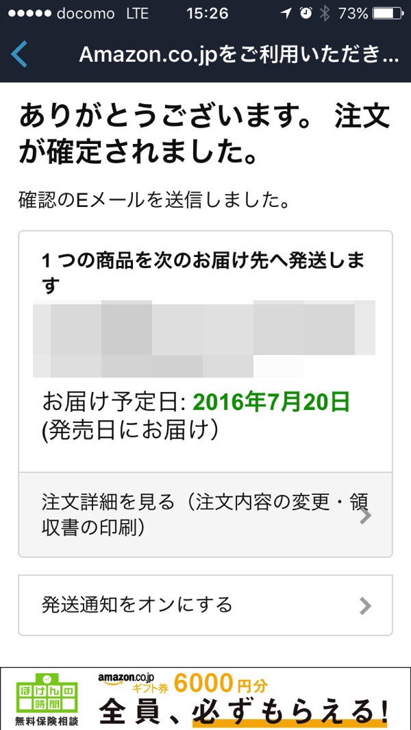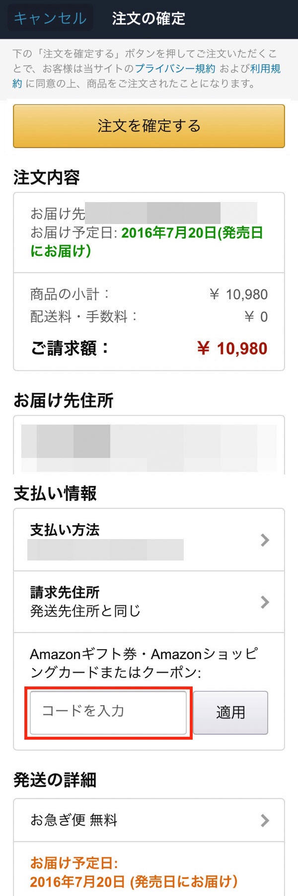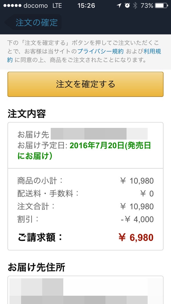そうすると4,000円が割引され、請求額が6,980円に変更されているのを確認します。ここで注文を確定するをタップすると予約注文が完了します。