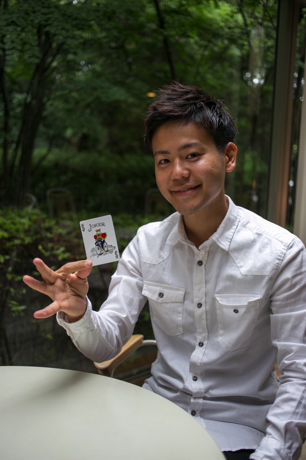 当日、待ち合わせて撮影開始。残念ながら雨模様で、予定していた場所ではありませんでしたが、雨の日でも撮影できる場所を用意し撮影。要望としてはマジシャンっぽくない爽やかなイメージの写真と、テーブルマジックができるということが分かる写真が欲しいとのことでしたので複数のパターンで撮影しました。