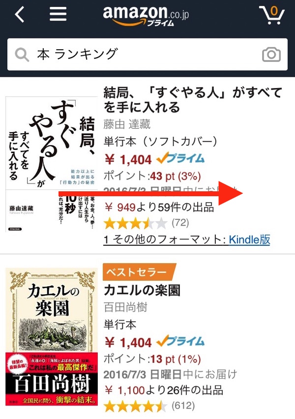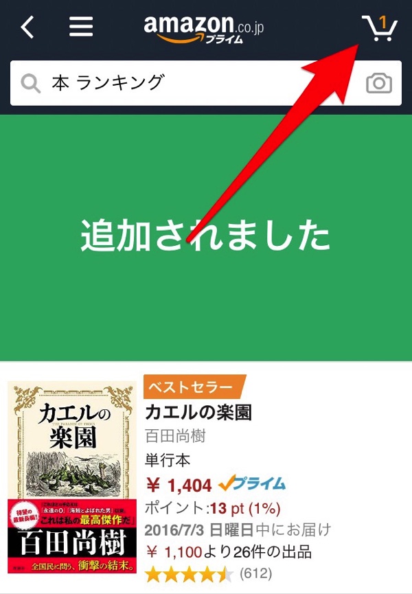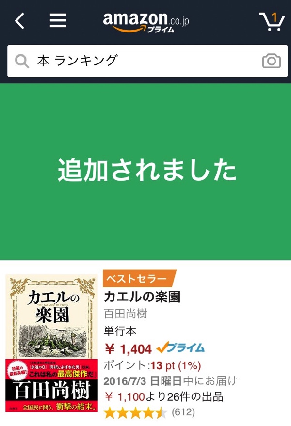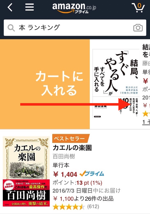 これでカートに入りました。通常なら商品をタップして、下にスクロールさせて「1クリックで買う」、もしくは「カートに入れる」をタップしないと行けませんが、右にスワイプさせるだけでショートカットができます。