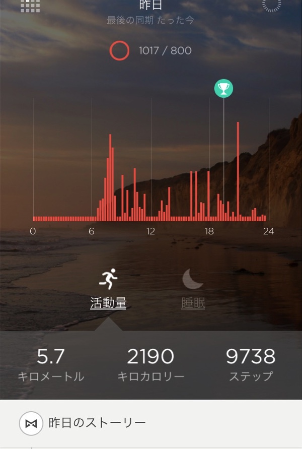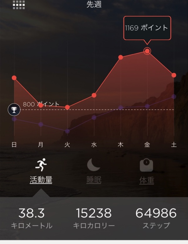 1日の活動量をポイントで表示してくれます。800ポイント目標にしていますので何としてもこの数値を超えるように動いています。