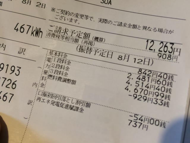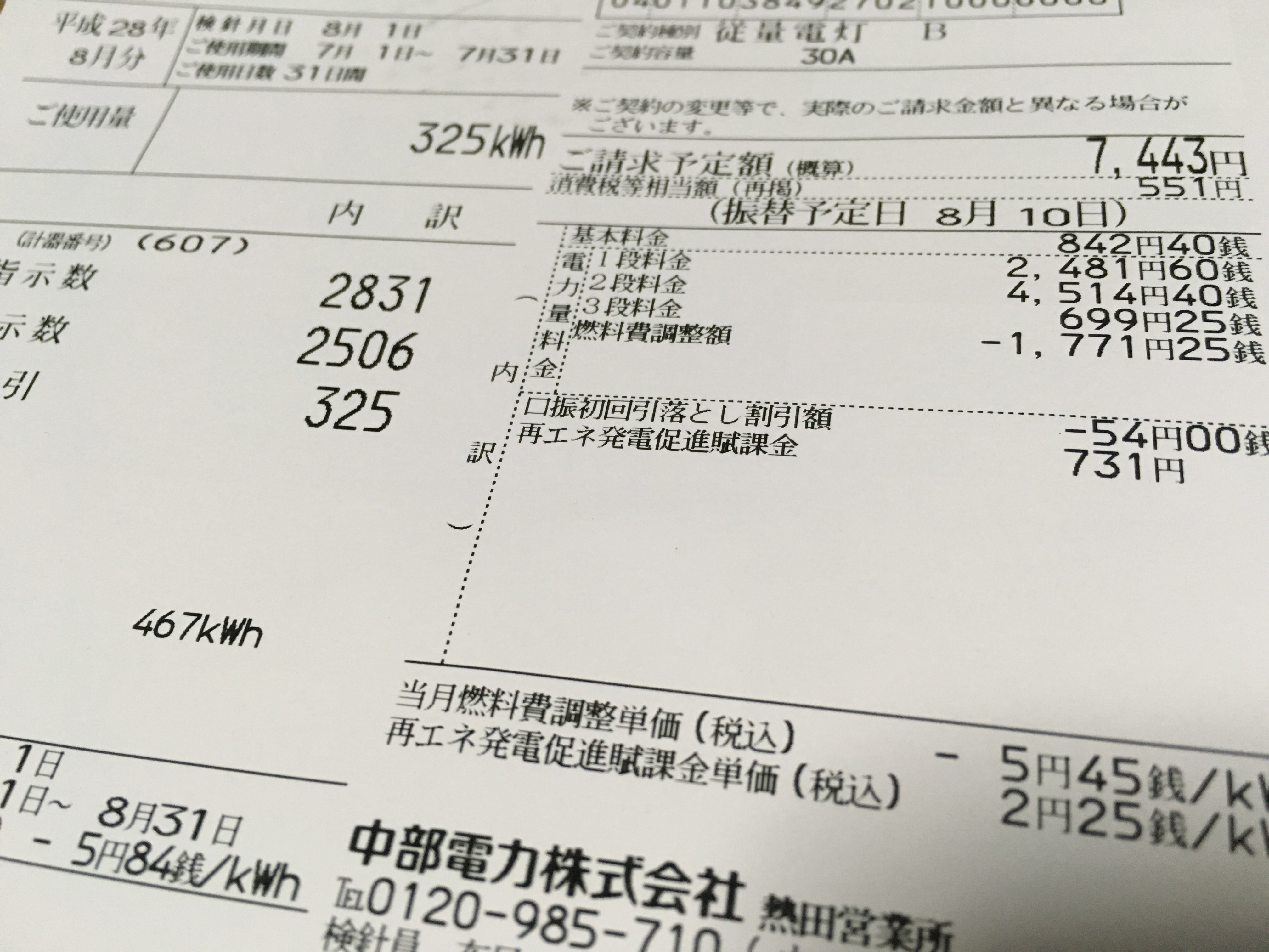結果は7,443円。去年は12,263円だったので約5,000円近く下がりました。つけっぱなしていなかった一昨年は約1万円だったのでそれと比較しても電気代が下がりました。クーラーをつけていなかった6月と比べても1,693円のアップのみ。