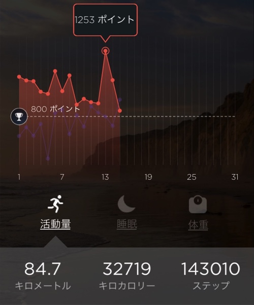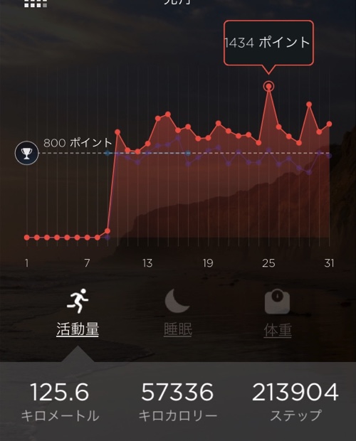一ヶ月間のグラフ。7月9日から使い始めたので2ヶ月にまたがっています。使い始めてから800ポイントを確実に達しております。