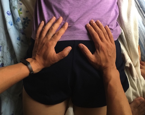 お尻と腰の間の少し凹んだこのツボを手のひらで優しくまわすように押します。ゆっくり押したり小刻みに押したり数分程度マッサージすると一気に改善します。私自身も時々腰に疲れが溜まることがあり、そんな時は妻にここをマッサージしてもらうと一気に良くなります。