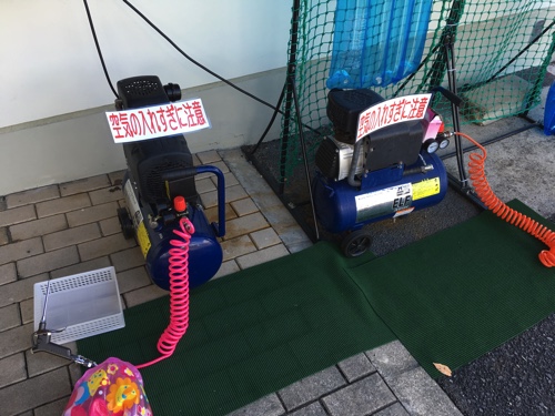 浮輪などを一瞬で膨らませることができるコンプレッサーが入口に2台置いてあります。