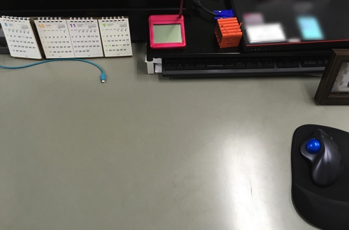 1日の最後はこの状態にしています。机の上にはトラックボールと写真立て以外、何もない状態にしてから帰ります。
