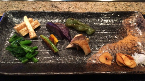 旬の野菜をシンプルな味付けでいただきます。左上は麻竹(まちく)。メンマの元になる筍。超美味しい。