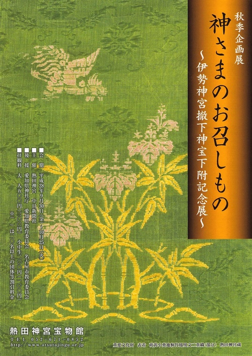 熱田神宮の宝物館で開催中の「秋季企画展 神さまのお召しもの 〜伊勢神宮撤下神宝下附記念展〜」へ行ってきました。熱田神宮へは毎月1日に必ず参拝しておりますが今月2回目の参拝がてら企画展へ。気になる特別展示があるときは拝観しています。