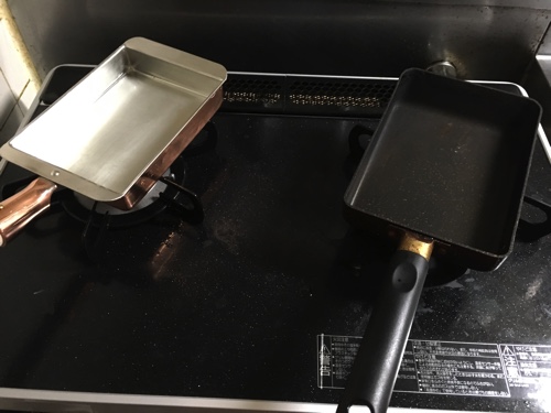 右が今まで使っていたマーブルコートの卵焼き器、左が今回購入した銅製卵焼き器。銅製なのでずっしりと重みがあります。