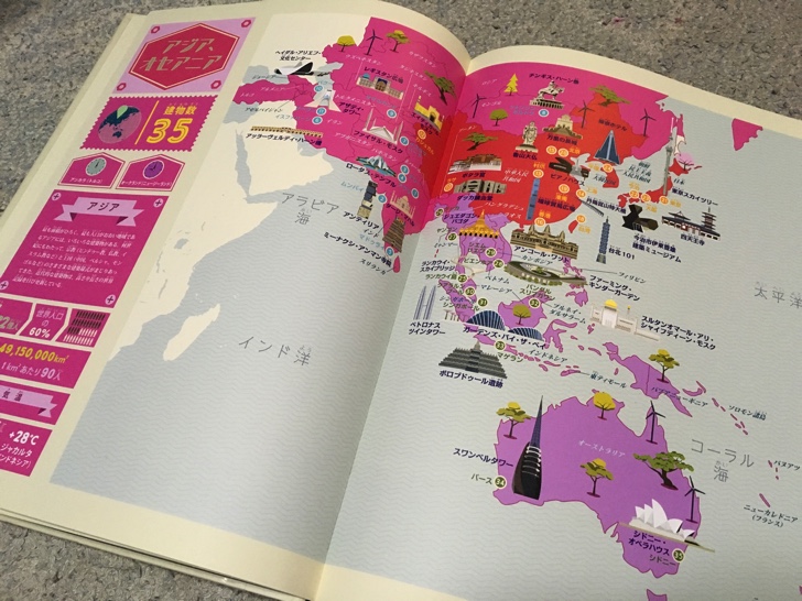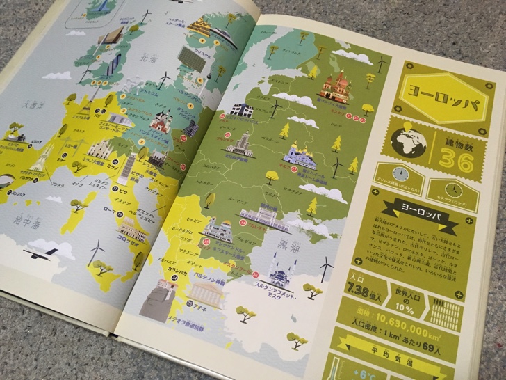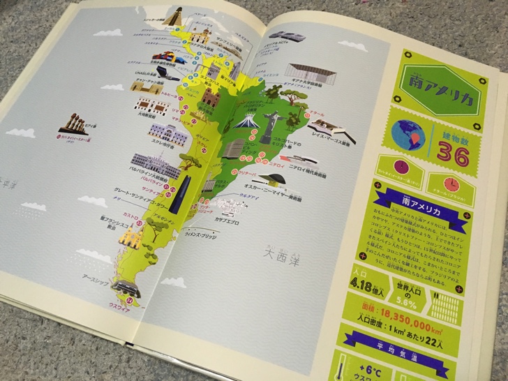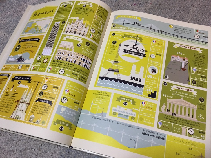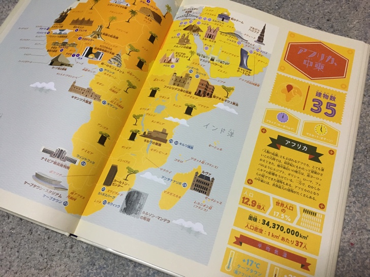 縦37cm×横27cmとかなり大判サイズの本で世界のすごい建築がオシャレなイラストで紹介されています。