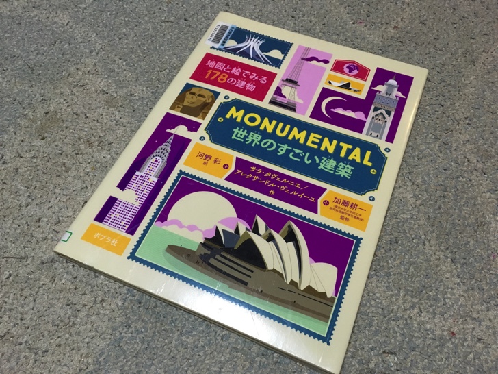 先日図書館に行った際に図書館スタッフのおすすめコーナーに「MONUMENTAL 世界のすごい建築 地図と絵でみる178の建物」という本が置いてありました。借りようと窓口に持っていったら貸出中でしたが、とても気になったので予約して借りてきました。