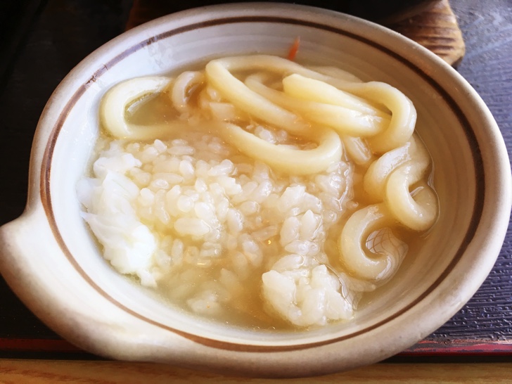 雑炊が美味し過ぎて最後の一滴まで完食します。少し塩分取り過ぎかなと思うこともありますが、うどん自体が元々薄味なのと普段は外食することは少なく、塩分控えめの生活をしているので問題ないでしょう。