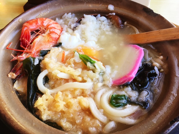 プリプリの海老がたっぷりの「かき揚げ天ぷらうどん」が特に絶品でほぼ毎回これを食べていましたが最近は違うメニューを頼むことが多くなりました。それが今回紹介する「鍋焼きうどん雑炊」なるもの。