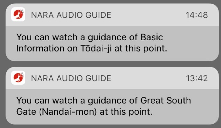 南大門、大仏殿などのスポットに近づいたらiPhoneにプッシュ通知され、タップすればアプリが立ち上がり動画を視聴することができます。それぞれの歴史などを動画で紹介してくれますので、さらに東大寺を理解し楽しむことができます。周りの迷惑にならないようイヤホンは必須。Bluetoothのイヤホンがオススメ。