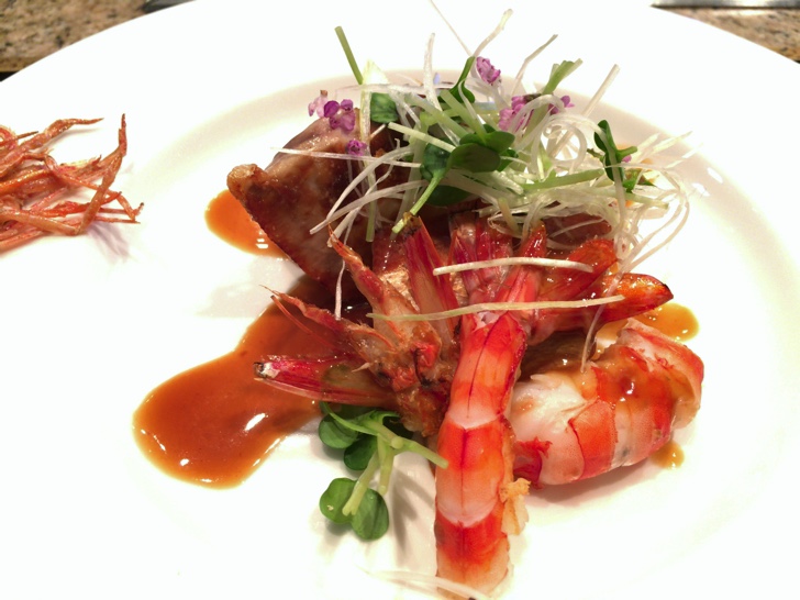 今回シーフードメニューは寒ブリ大根と車海老。刺し身で食べても美味しそうな厚切りの寒ブリと8時間真空調理した大根の煮物を鉄板で焼いた一品。あまりの美味しさにこのあとは写真を撮るのを忘れてしまいました。