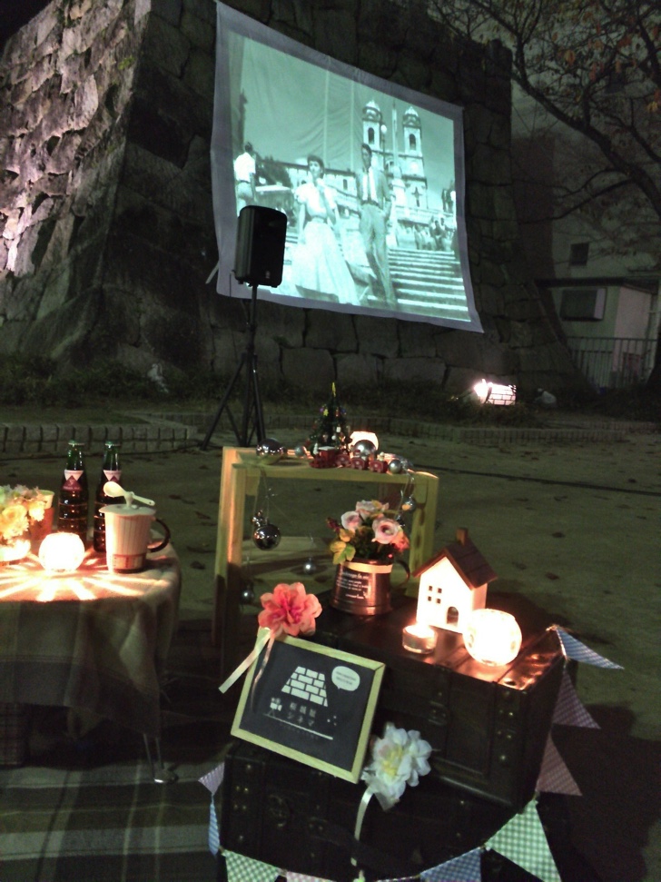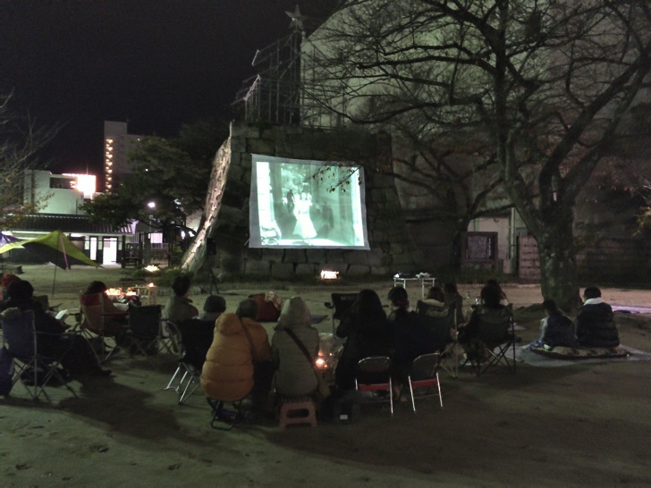 観客は第1回目ということもあり50人ほどでした。時間とともに増えてきたので最後はもう少し多かったかも。城址の石垣にスクリーンが張られてそこに投影されておりなかなかの迫力でした。近隣に住宅などかあるためか音は控えめ。ただし字幕があるしストーリー重視の映画のため特に問題ありません。アイアンマンとかSFXバリバリの映画だと物足りないかもしれませんが古典映画はこのぐらいがちょうどいいかな。