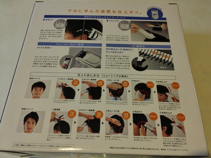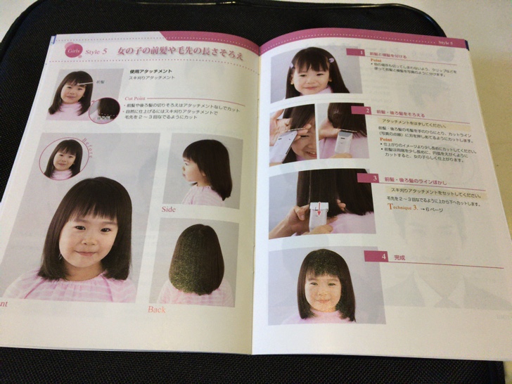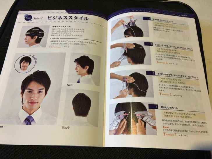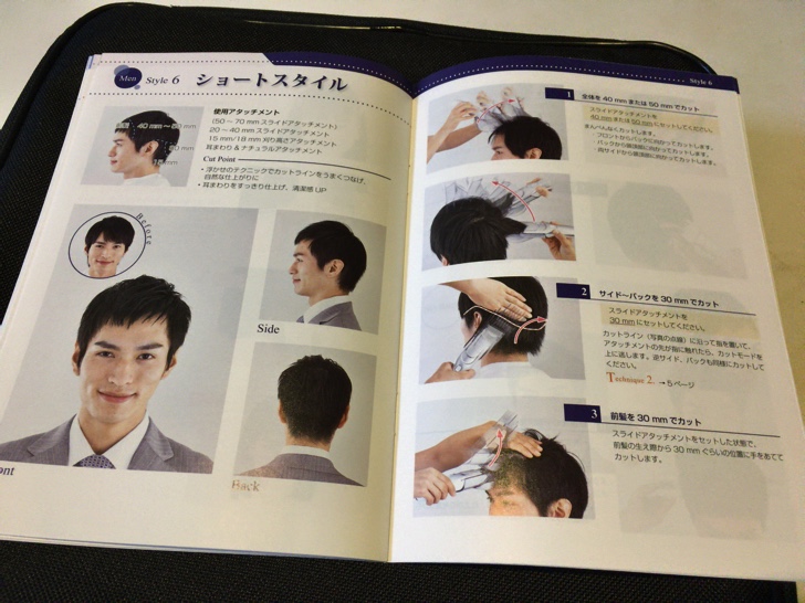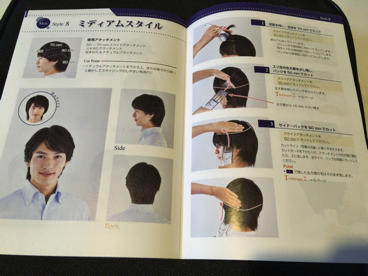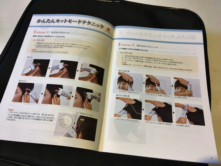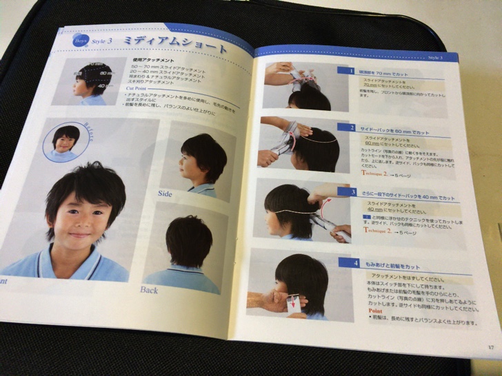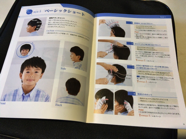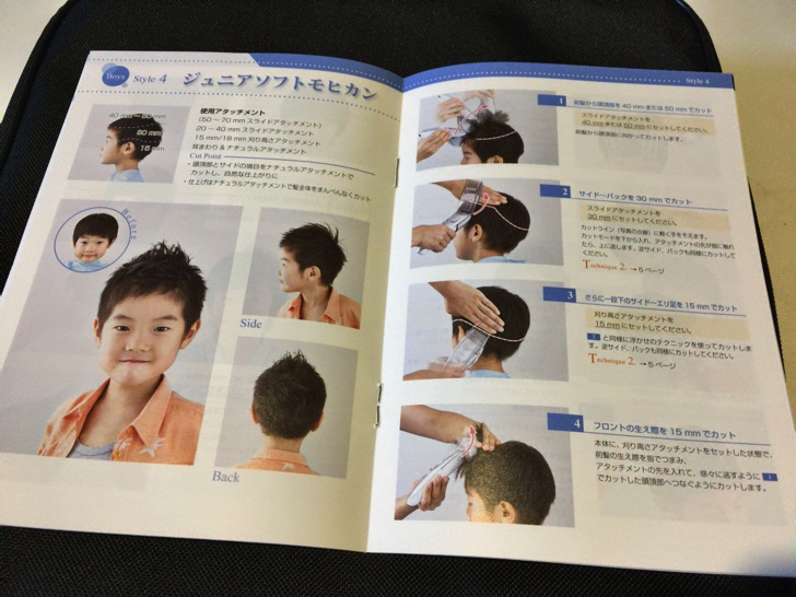 私は坊主頭なので9mmと6mmのアタッチメント2つあれば十分。坊主頭なら他のアタッチメントは使うことはありませんが女の子にも使えるみたいなのでひょっとすると娘の髪の毛を少しカットするときには重宝するかも。付属品として「カットモード テクニックBOOK」が付いており、このバリカンを使ってカットするテクニックが色々載っています。そんなに難しくはないようなので子どもが男の子ならこれで十分対応できそう。パートナーが起用な方なら成人男子でもカッコよくカットできそう。