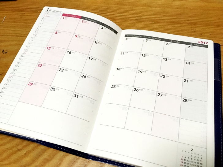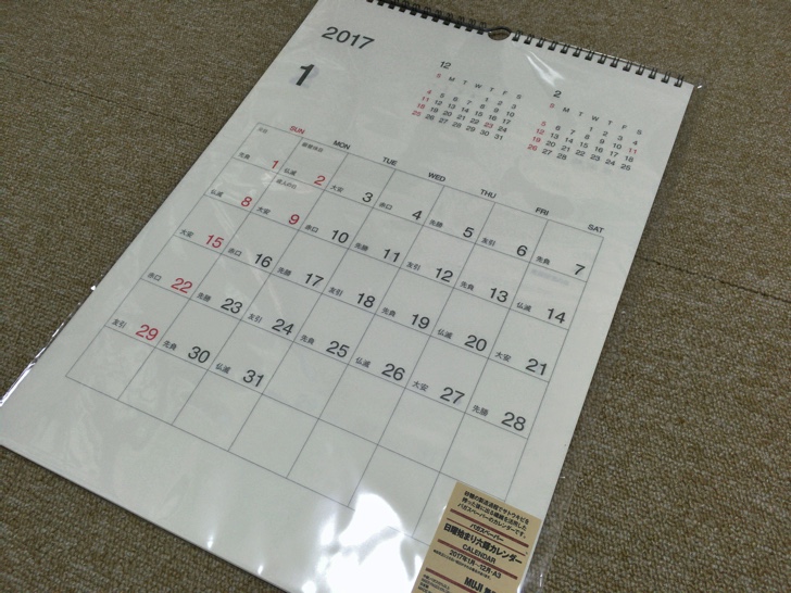自宅の壁掛けカレンダーも日曜日始まり。妻も日曜日始まりがお気に入りみたいで、感性が一緒で助かります。ちなみに無印良品のカレンダーを使っています。シンプルで飽きがこないのでオススメ。こちらも6段タイプ。以前、5段タイプを買って後悔したことがあります。月によっては月末の土日が重なってしまい不便でした。