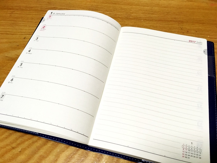 最近、手帳は無地よりもスケジュール欄があった方が管理がしやすいのではと考えていたら、この情報が入ってきました。書店へ足を運んだら能率ダイヤリーはたくさん種類がありどれを選んでいいか迷いましたが、藤原氏が勧めていたタイプに当てはまる「一週間のスケジュール欄と後ろに大量のノート欄」がある手帳という条件である程度絞られました。そして私の場合、iPhoneで日曜日始まりのカレンダーをずっと使い続けているので、ほぼ一択となりました。