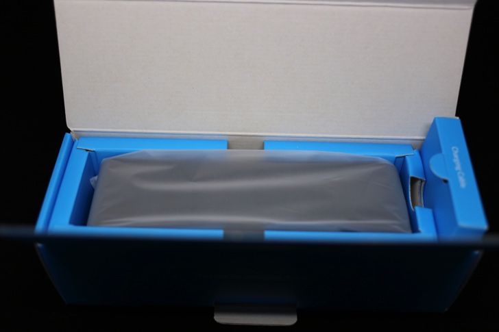 開封の儀。外箱は青と白を基調としたオシャレなパッケージデザイン。
