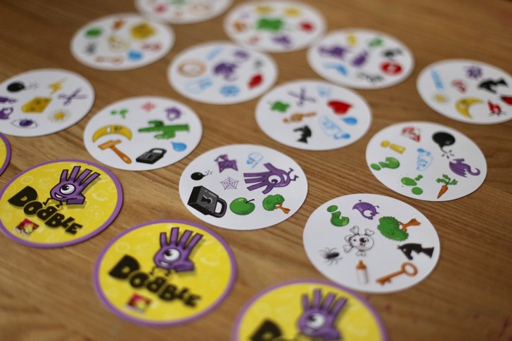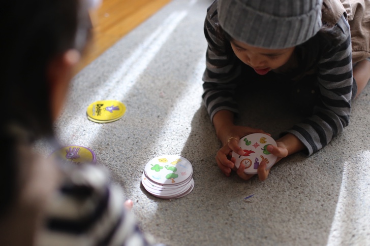 やっとサンタがやってきて、子どもたちと遊ぶことができました。感想は「メチャクチャ楽しい!」。ルールはとても簡単で6歳の次女もすんなり覚えて一緒に楽しめます。50種類以上のマークのうち8つが描かれた55枚の円形のカードで遊びます。全てのカードには他のカードとたった1つだけ共通するマークが描かれており、それを探すことが目的となります。