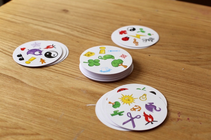 やっとサンタがやってきて、子どもたちと遊ぶことができました。感想は「メチャクチャ楽しい!」。ルールはとても簡単で6歳の次女もすんなり覚えて一緒に楽しめます。50種類以上のマークのうち8つが描かれた55枚の円形のカードで遊びます。全てのカードには他のカードとたった1つだけ共通するマークが描かれており、それを探すことが目的となります。