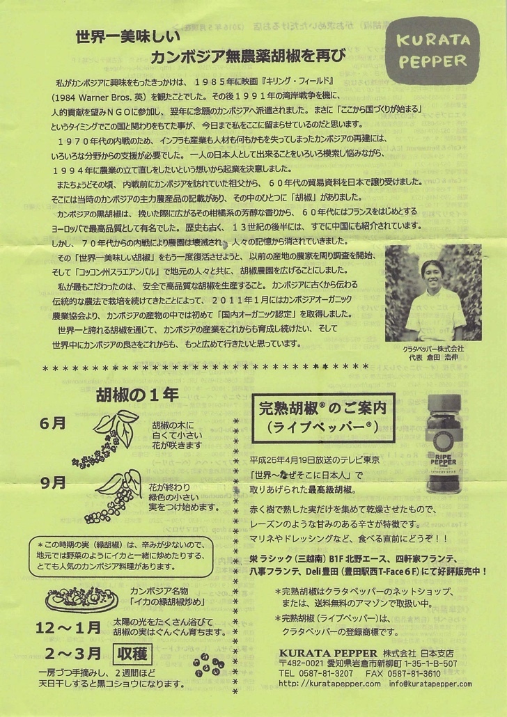 胡椒好きな方はもちろん、料理をより美味しく召し上がりたい方はぜひこの「クラタペッパー」を試してみてはいかがでしょうか。チラシに書かれている世界一美味しい胡椒というのは大げさではなく真実。自信を持ってオススメいたします。