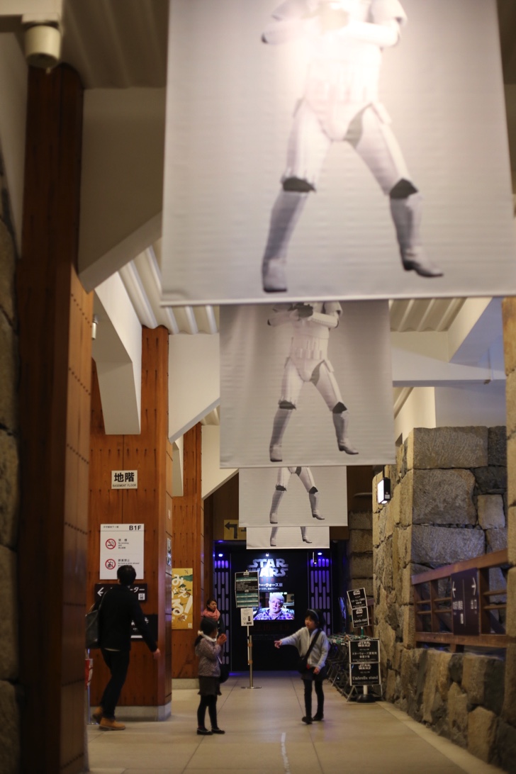 天守閣に入るとストームトルーパーのバナーが天井から下がっていました。なぜ、このキャラクター選択なのかイマイチ謎。もし自分がこのバナーのキャラクター選択するならダース・ベイダー、R2−D2、C-3PO、ヨーダを並べます。