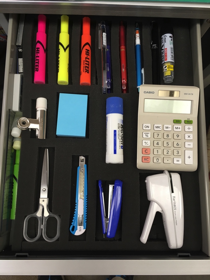はさみ、カッター、ホッチキス、ハリナックス、印鑑、付箋、スティックのり、蛍光ペン、フリクションボール赤・青、シャープペンシル、ボールペンを並べてみました。まだ空きスペースがありますが、ここには電卓を置いて様子をみています。