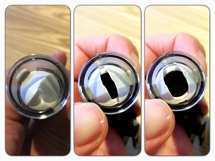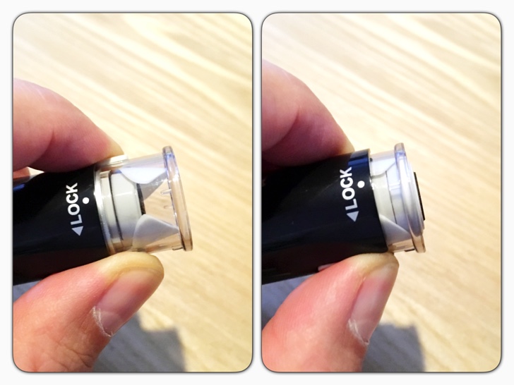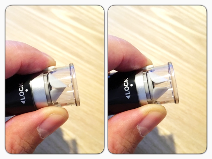 キャップレスなので、通常は蓋が閉まった状態になっており、押すと蓋が広がり印面が出ます。