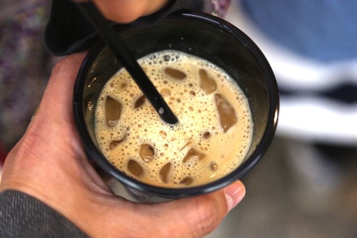 アイスコーヒーのボタンを押せば出来上がり。色はアイスカフェモカとアイスカフェラテの中間ぐらい。糖分は入っているのでガムシロップは不要。