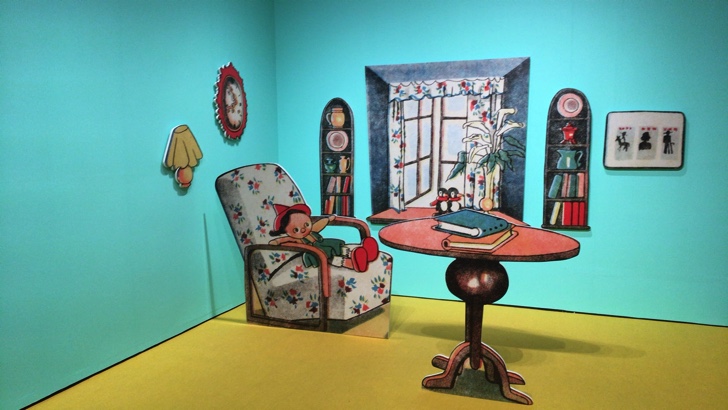 出口手前の撮影スポットではアニメの中に入り込むことができます。写真ではわかりにくいですが手前のテーブルと奥のソファの間に立つことができます。