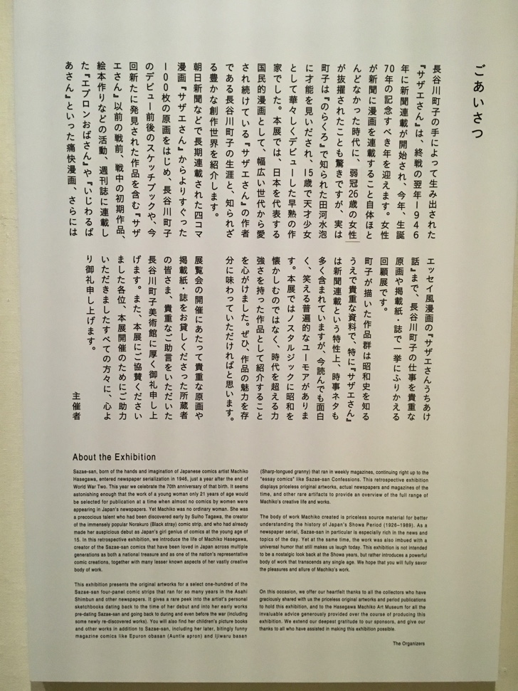 日本初の女性漫画家としてデビューし、昭和の文化史に残る国民的な漫画家・長谷川町子のまなざしと業績とを丹念にひもとくことができる今回の回顧展はアラフォー以上の方なら間違いなく懐かしさとともに楽しめます。一つずつ四コマ漫画を読んでいると相当時間がかかりますので、全部じっくり見たいなら時間に余裕を持って行くことをオススメいたします。筆者はあと何度か足を運んでみるつもり。