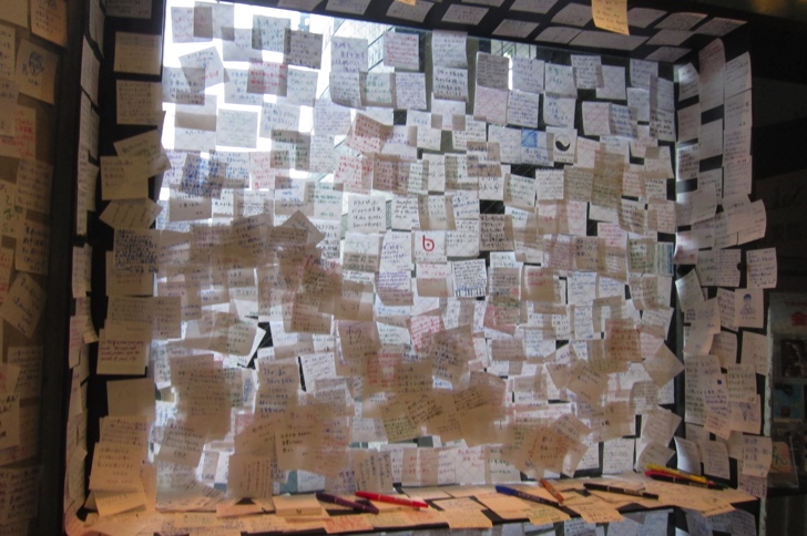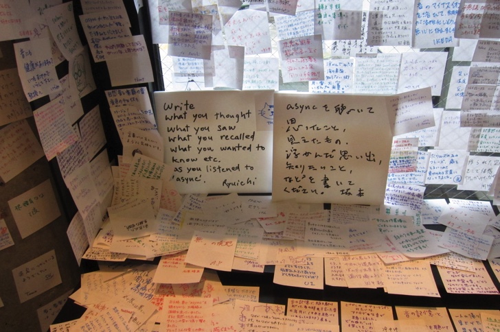 地下1階には「async」や旧作のアナログ盤の試聴、映像作品の視聴スペースと坂本龍一関連グッズショップがあります。1階の入口には今回の設置音楽展の感想が付箋に綴られています。様々な感想があり、これを見てさらに楽しめます。