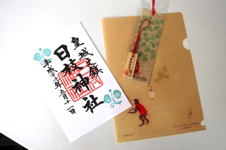 朱印帳集めているのですが今回当初行く予定をしておらず持ってこなかったので、紙に書いてもらいました。一緒にクリアファイルとキーホルダーを貰いました。クリアファイルは朱印帳に書いた場合は貰えないので、結果オーライ。おさるさんのイラストがとっても可愛い。ここ日枝神社には猿があちこちに祀られています。