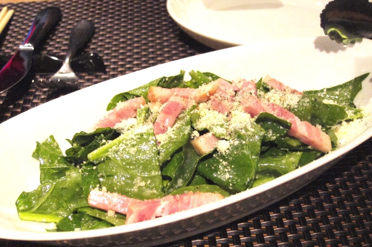 岩本農園の手作りベーコンとほうれん草シーザーサラダ。ほうれん草がめちゃくちゃ美味しい。ベーコンも臭みが全くなく絶品。