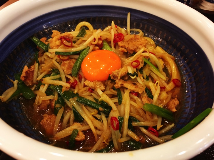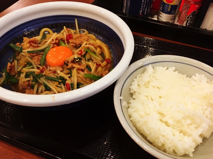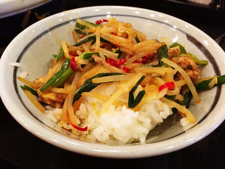 そして黄身を混ぜてもう一口。また違ったテイストでこれまた旨い!あっという間にうどんがなくなりました。上に乗っていた、もやし、ニラ、ミンチが残ったのでライスの上に乗せていただきました。