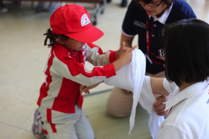 救急員の恰好をして包帯を巻く体験をしました。普段から髪の毛を結ったりしてるので上手に包帯を巻いて結ぶことができて看護師の方に褒めていただきました。我が子ながら感心し、感心。