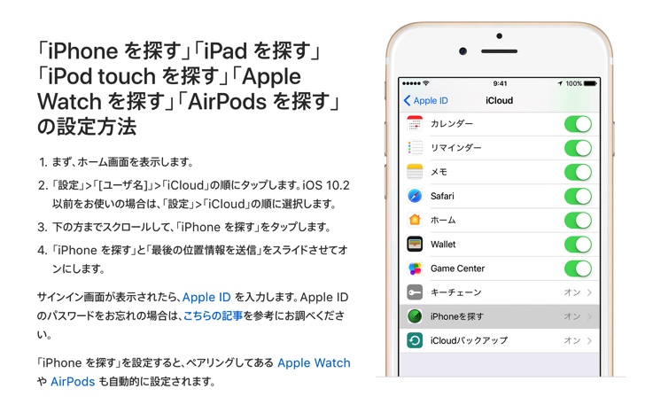 設定しておけばiPadやMacなどから今どこにあるかがひと目でわかります。逆もまたしかり。バッテリーが相当少ない情報でも位置情報は発信しつづけてくれますので、探り当てることが可能。