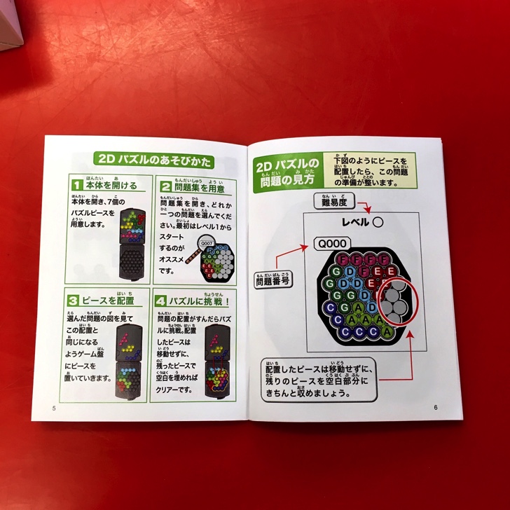 コンパクトなケースに入っています。中に解説・問題集を一緒にしまうことができますので持ち歩きに便利。2Dは内側の窪みを使い、3Dは外側の窪みを使います。