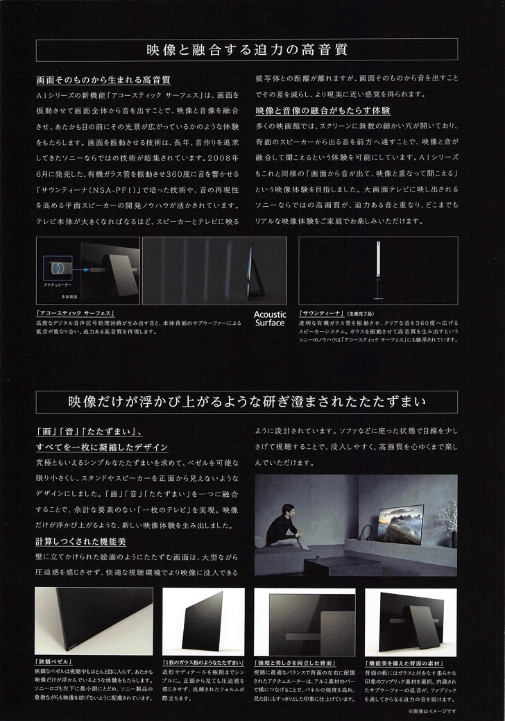 「BRAVIA A1」は背面スタンドで支える写真立てのようなデザインで画面のパネルが後ろに5°ほど傾斜しており、座って観た時に一番綺麗に見える角度になっています。スピーカーは画面自体が共鳴板になっていて画面から音が鳴ります。重低音を再生させるサブウーハーは後ろのスタンドに内蔵されておりこのクラスでは一番音質がいいのではないかと思われます。
