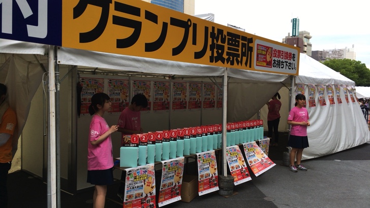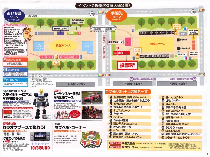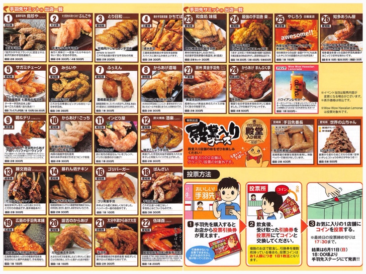 今回のイベントは各地の手羽先店28店舗が集結し、グランプリを競い合います。手羽先を購入するとお店から投票引換券が貰え、飲食後受け取った引換券を投票所にてコインと交換。お気に入りの1店舗にコインを投票する仕組みになっています。「複数のお店で飲食し、引換券を複数枚持っている場合も投票コインはお一人様につき1日1枚まで」と書いてありますが、どうやってそれを見分けるのか、いまいちよくわからない仕組みではありますが、細かいことは気にしないことにしましょう(笑)