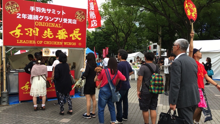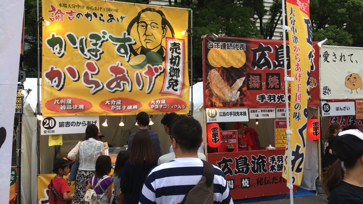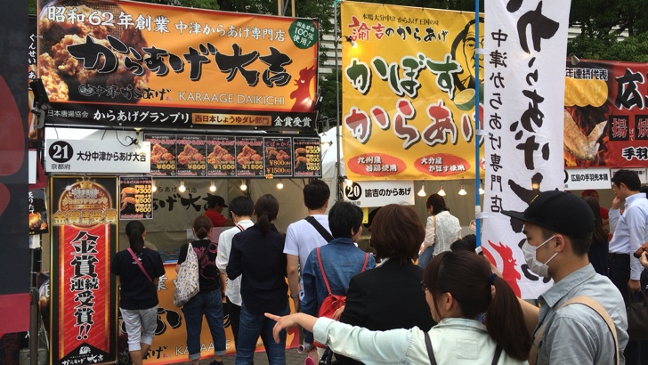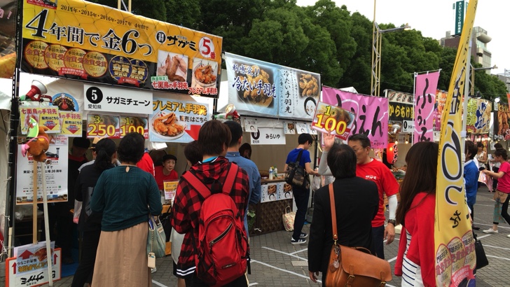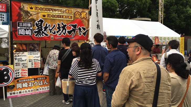 訪れたのは9日(金)17時半過ぎでしたがすでに大勢の人で賑わっていました。行列ができている店舗は「暴れん坊チキン」「からあげ!ごっち」「サガミ」「からあげ大吉」「諭吉のからあげ」「からあげ番長」の6店舗のみ。「からあげ番長」は殿堂入りしていますのでグランプリ投票の対象外となります。おそらくは「からあげ番長」を除いた5店舗の中からグランプリが選ばれるような気がします。
