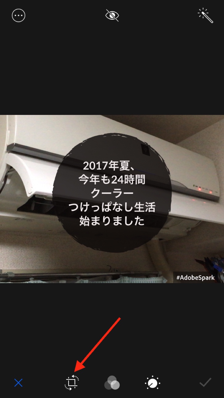 ただしこのアプリで作成すると右下に「#AdobeSpark」とロゴが入り目障りなのでiPhoneの標準アプリでトリミングします。先程テキストの位置を少し上にしたのはトリミングして下が切り取られた時にテキストがちょうど中央にくるようにするため。