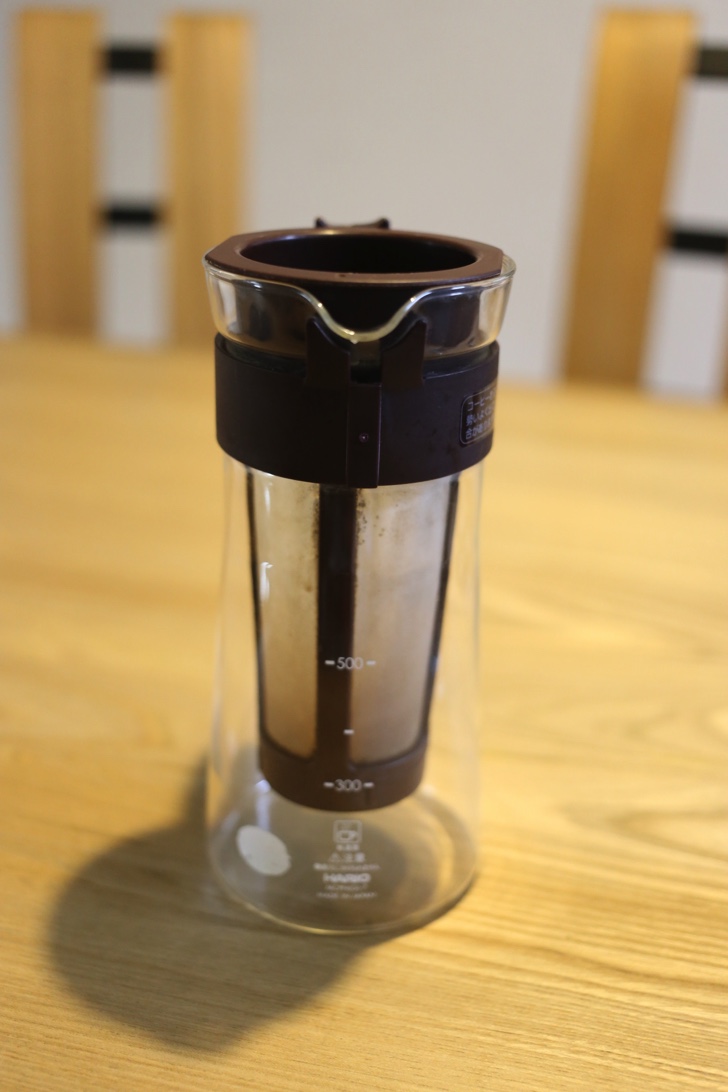 挽いた豆を中のメッシュフィルターに入れて水を350ml注いで冷蔵庫で一晩寝かせます。時間がかかるので寝る前に作ります。
