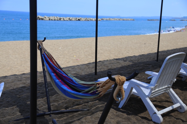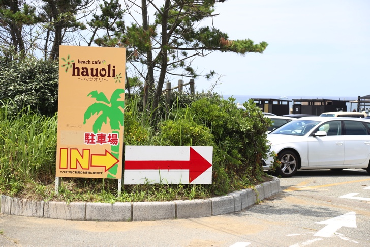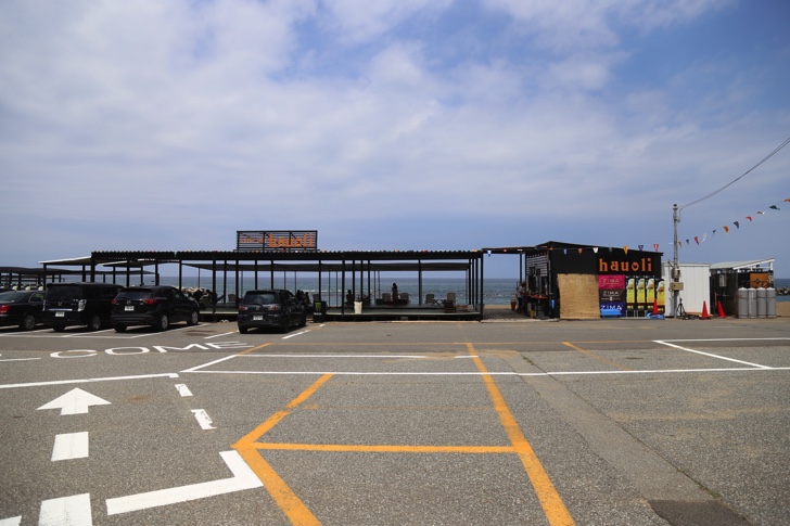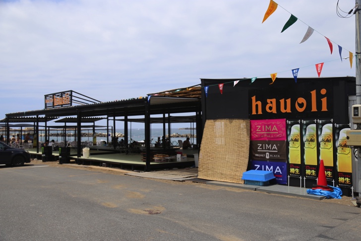海の家は海岸沿いに10件ほど並んでおり、中でもハワイアンテイストの「Hauoli(ハウオリ)」がオススメ。この看板が目印。入口は二箇所あります。